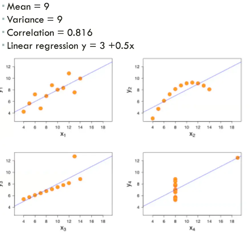 - when looking at stats you can have 4 different data sets that average out to be the same but give out different values
