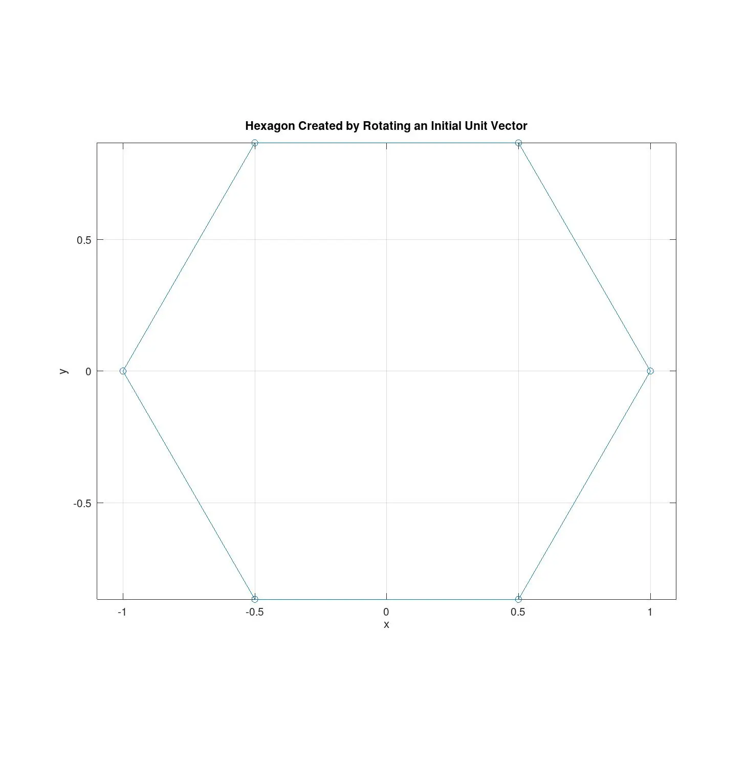 To create the hexagon, we rotate by radians (60 degrees) five times, appending each result to obtain the vertices of the hexagon.