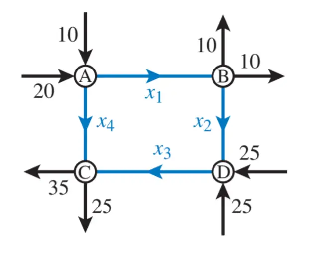At each node, water flow in = water flow out