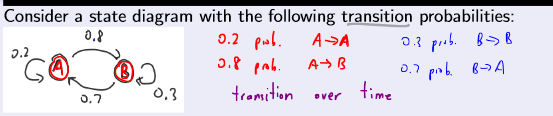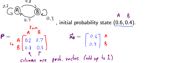 A markov chain on n states is a system whose state vectors are proabability vectors and the state vector at time 0,1,2,… are denoted x0,x1,x2,…,where x0 is the initial probability vector, and x1,x2,... are determined by