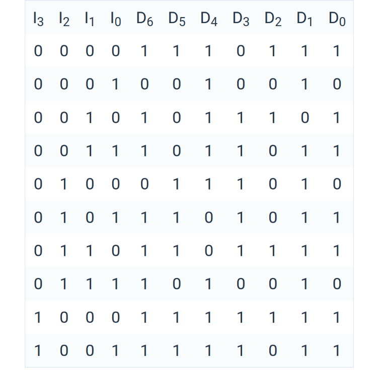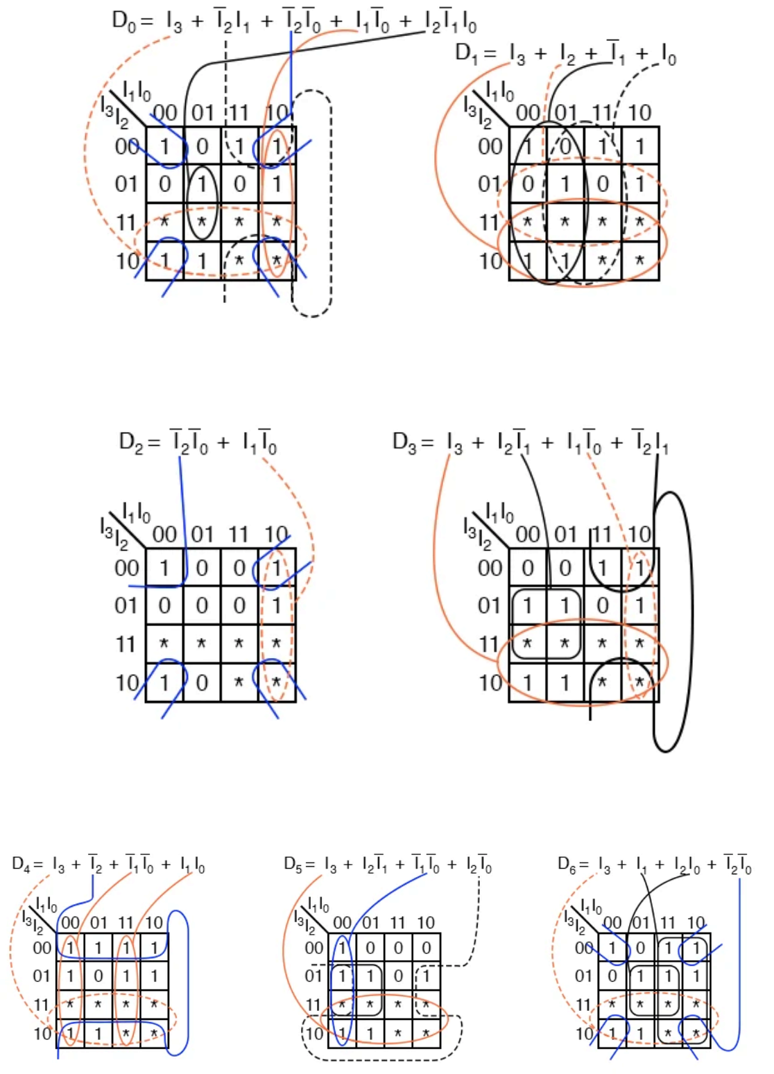To simplify our expression we use karnough maps for each output (so seven k maps :))