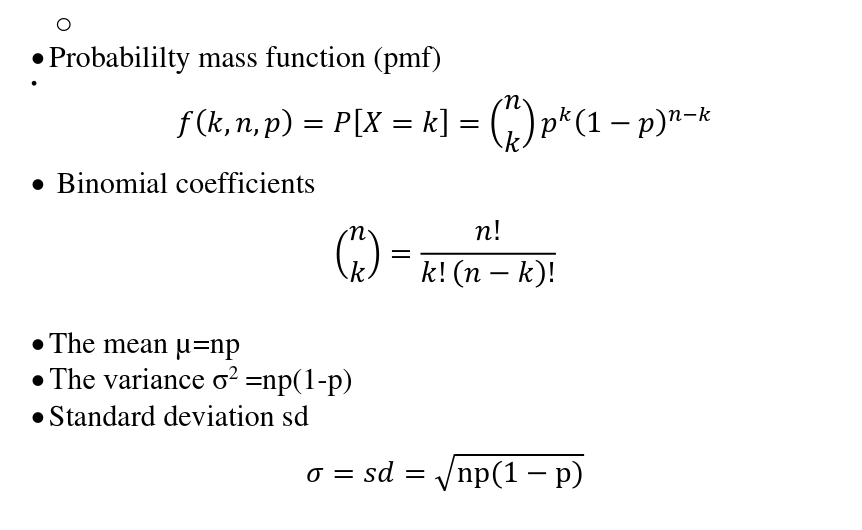 Binomial Distribution A discrete model for n independent Bernoulli trials (success with probability p, failure with 1−p). Random variable X = number of successes. Probability-mass function (PMF) P(X=k)=(kn)pk(1−p)n−k,k=0,1,…,n. Mean and variance μ=np,σ2=np(1−p).